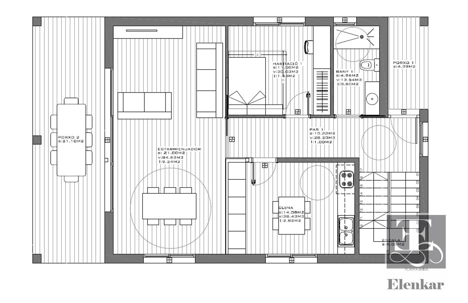 •  Suelo de gres tipo parquet.
